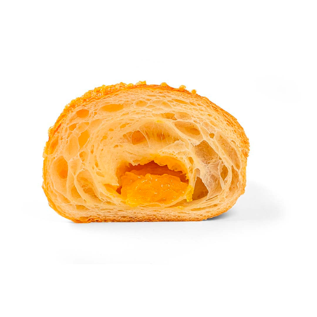 Французький круасан з абрикосовою начинкою, прикрашений посипкою помаранчевого кольору, що не залишить цього красеня непоміченим на вашій вітрині. Виготовлений з додаванням пшеничної закваски, що підкреслює його смакові властивості. А тривале розстоювання тіста покращує структуру круасана та увиразнює його шари.
